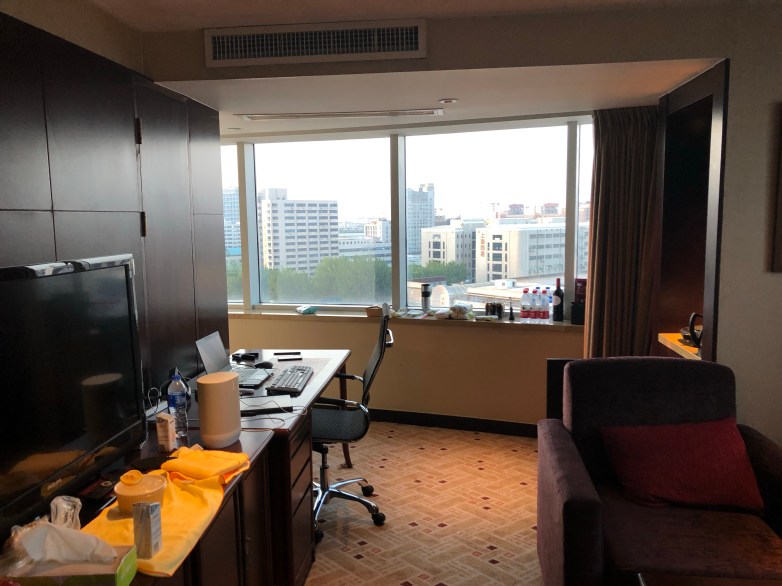 Woo-hoooooo!!!!! After a knock on my door and an engrossing dialogue with another suited up astronaut (using some Chinese instantaneous translation app), I understood that I was “liberated” to spend quarantine with Vanessa and Liz!!!! So I packed all my stuff (that I had carefully unpacked the day before) and moved in to Van and Liz’ giant room! Joo-hoo!!!!!
